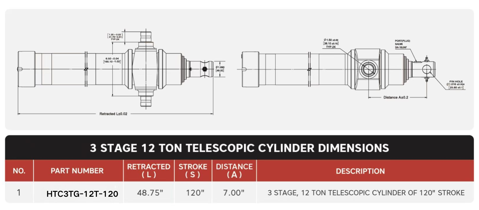 "HTC3TG-12T-120", 3 Mərhələli, 12 Ton 120" Vuruşlu Teleskopik Silindrlər