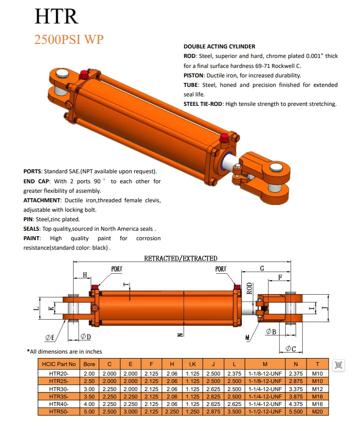 Bu HCIC Standart Clevis Qaynaqlı Silindrdə 4 "delik, 36" vuruş və 2" diametrli çubuq var. İkili fəaliyyət SAE 8 (-08) ORB(F) işləyən portlar 2500 PSI maksimum iş təzyiqi Clevis montajları 1" montaj sancaqları daxildir Parıldadıcı qara boya davamlıdır və solmaya davamlıdır